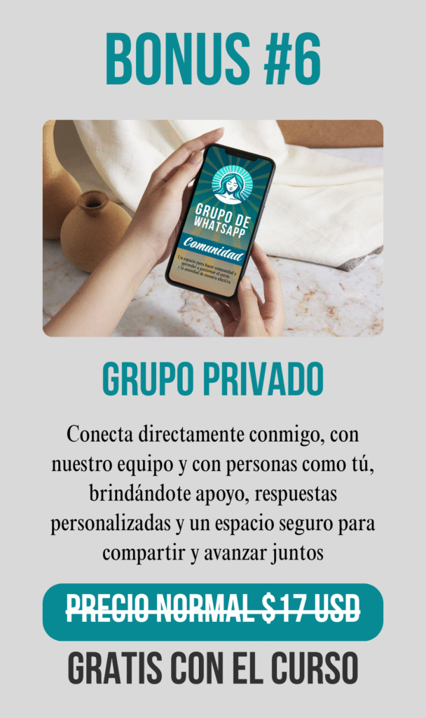 Vas a tener acceso a nuestro Grupo Privado, donde podrás hacer preguntas y recibir apoyo directo de nuestro equipo y otros miembros que están atravesando el mismo proceso que tú.